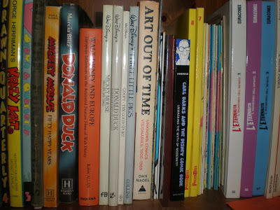 Riprendiamo l'esplorazione. Alcune delle monografie in lingua inglese di questo scaffale provengono dalla collezione di un grande appassionato, organizzatore, ma soprattutto art director. Lui sta benissimo, i suoi fumetti un po' meno... Ma non poteva più mantenere un deposito che sembrava la stiva del Titanic. Così qualcosa, nella mia raccolta, ha il suo pedigree: negli Stati Uniti, aggiungerebbe valore all'oggetto. Proviene dal Titanic la non comune monografia di Horn sulle donne nel fumetto; un'antologia del grande vignettista Peter Arno; il primo volume di un'enciclopedia dei comic books; l'arte dell'illustrazione umoristica e qualche altro tomo. Semminascosto c'è il primo, e per ora unico, volume con le dailies del Krazy Kat di George Herriman, una delle vette assolute del Fumetto mondiale. Accanto, due serie di fascicoli che risalgono agli inizi della mia mania accumulatrice: sono la collezione di Tarzan Special e quella di Tarzan Super, edizione Cenisio (primi anni Settanta): la prima con le domenicali, in bianco e nero, disegnate dal grande Russ Manning, la seconda con la collezione completa delle giornaliere. Fra le due, un fascicolo edito dall'ANAFI (Associazione Nazionale Amici del Fumetto e dell'Illustrazione) con le sundays conclusive, che Cenisio non riuscì a pubblicare.
